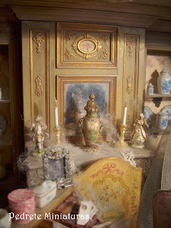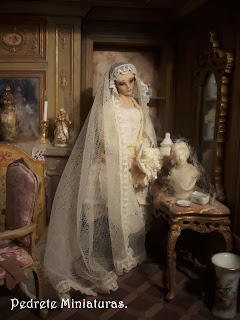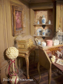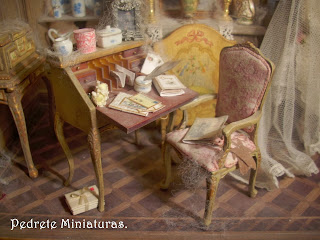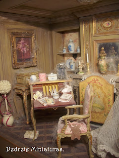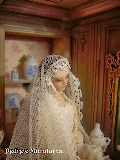 El año pasado participé junto a una amiga en un reto de crear ella una escena en color rosa y yo otra en color verde. Ya ambos detestamos dichos colores. Pilar consiguió terminar su escena a tiempo, yo mirad cuando lo he conseguido... El personaje es Dª María Zayas, una muñeca que me hizo Mª Nieves Mergelina. Creo que la escena le viene al pelo.
