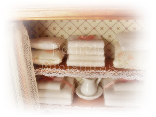 Tengo que reconocer que aún a riesgo de resultar excesivo, me encantan las mesas de cocina repletas de cosas!! En esta podemos ver una cesta de verdura y un queso azul de Angie Scarr, una lata de aceite Carbonell de Matilde Mora, unos tarros de miel de Mon & Mon, unas tostadas de Gema Minayo, unas uvas de Lola Alcántara, una botella de vivo (con vino en su interior) y un sacacorchos de Marga Vives y porcelana de Stokesay Ware y Old Bell Pottery. La cesta de la compra es también de Gema Minayo, y la bandeja de desayuno está decorada con un imprimible de los que suministra la revista Miniaturas.